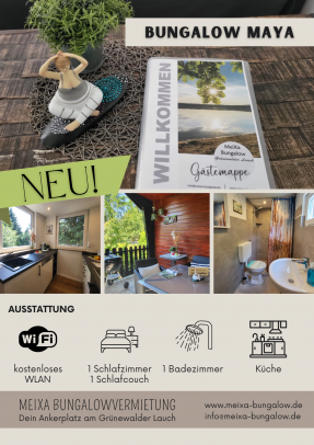 Der Bungalow liegt nur weinige Gehminuten vom Grünewalder Lauch entfernt. Er bietet alles was das Urlauberherz begehrt - eine voll ausgestattete Küche mit Spülmaschine, ein Schlafzimmer mit Doppelbett und Rollo, einen Wohnbereich mit TV und Essecke sowie eine große, überdachte Terrasse.